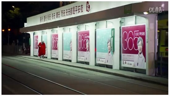 For Menzan, the discipline of slow walking meditation reaps physical as well as spiritual benefits. He states that kinhin serves to “revive one’s spirit [and] to revitalize,” and brings increased energy, stamina, digestive and overall health, and in and through all these, samadhi or single-pointed meditative absorption (). On one level, Walker seems to also commend the physical benefits of kinhin as remedy to modernity’s unwholesome pace of life. With the uncanny visual perceptivity that characterizes Tsai’s auteurist eye, the film deftly captures the symptoms of physiological malaise dotting the city. For example, the tram stop that the walker passes under in the evening is covered with advertisements for what looks like an insomnia medicine (see Figure 4). The signboard slogan reads: “Spring, summer, autumn or winter, rain or shine—every day can bring a peaceful night.” In the original, the phrase “peaceful night” is ping’an ye (平安夜), the exact Chinese title of the well-known Christmas hymn, Silent Night. Might Tsai be obliquely comparing the city-dweller’s quest for rest to the Christian hope for messianic peace? In this scene, the walker also finds an arresting foil in an older lady who hobbles unwittingly into the shot. For almost 20 s, the two of them are the only persons at the stop, composing an odd showdown of sorts as each makes their way laboriously in the direction of the other. While the walker’s hyper-slow gait is a result of countercultural choice, the lady’s severe limp (from what might be bow legs) poignantly evokes not only the plight of those left behind by the modern rat race, but also the inescapable facticity of old age and human sickness, two of the four sights that led to Gautama’s “great going forth” (Skt: mahapravrajya).