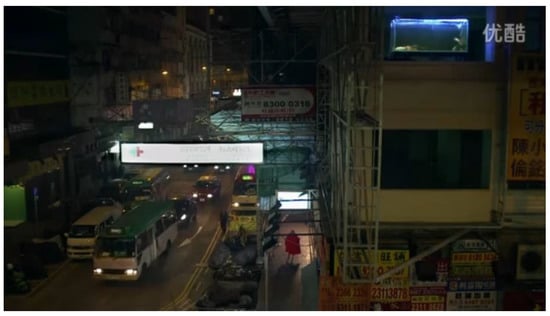 Much of the time, the walker is foregrounded in a shot and immediately visible. It is also usually not difficult to recognize the milieu that the walker is traversing. For instance, there is little doubt that the film’s opening two shots respectively show the walker making his way down a flight of stairs in a building, then in front of a patch of wall plastered with property advertisements. However, like incremental stages of meditative practice, many subsequent shots require greater cognitive and contemplative effort before we are able to locate the walker or make better sense of the mise en scène. Recalling Buddhaghosa’s instructions for the expressly “bounded” and “circumscribed” form of certain heuristic kasinas (), these scenes bid us to dwell even more patiently within the frame. Each shot comes as a visual field awaiting phenomenological grounding. In one of the evening scenes, for instance, a high angle extreme long shot (see Figure 5) shows the walker dwarfed and hidden by surrounding buildings as he creeps along a scaffolded pavement. But this shot turns out to be a prelude to the more significant ocular riddle that ensues.