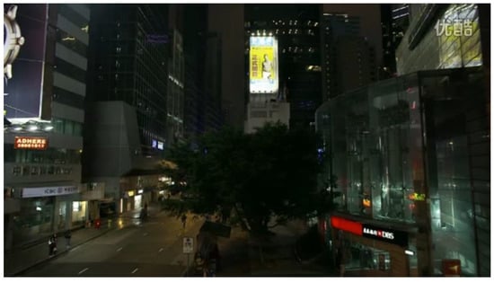 Via what nearly constitutes a bird’s eye view shot of Queen’s Road Central (see Figure 6), an avenue flanked by commercial buildings, Tsai beckons the viewer to participate in his playful variation on Where’s Waldo? In this shot, the walker is reduced to such a miniscule scale that one would probably need to scan the entire screen carefully to spot him. The natural darkness of this night scene leads us to look even more intently. To the right of the shot, there is the glassy, futuristic-looking façade of The Center, one of Hong Kong’s tallest and most iconic skyscrapers. To the top, an enormous billboard looms in the distant background, announcing via a yet-unidentifiable model the official opening of some facility. To the bottom and center of the shot, the concrete pavement leads to an august, verdant tree, an unlikely oasis in the middle of the urban jungle. And to the left, a few pedestrians are waiting for taxis as a lit signboard goes off. Here, we finally find the walker, virtually frozen in hyper-slow walking meditation.