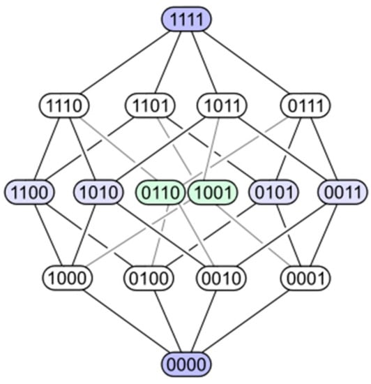 For example, we read the graph in Figure 2 from top to bottom, where a given node A has greater priority than node B if and only if A is above B and an edge connects A with B. In Figure 2, each node contains a bitstring, a lexical (rather than numerical) sequence of symbols 0 and 1. Bitstrings are ordered in the same spirit as words in a dictionary, where symbols are compared pairwise by position; in other words, the first symbols of each bitstring are compared, and then the second, and so on. In this example, we prioritize the bitstring 1011 over the bitstring 1001, because every position of the first bitstring is no less than that of the second bitstring. However, the bitstrings 0101 and 0011 are incomparable, since each bitstring has at least one symbol that is larger than its corresponding symbol in the other bitstring. The edges in Figure 2 provide a visual representation of the properties of the partial ordering we defined just above. The data configured in this way may be of any sort, including ethical commitments and objects of value, as we shall explore below.