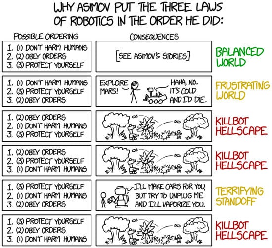 Autonomous machines may implement these laws using a decision tree (see Figure 1) to navigate in the real world. The ordering of the laws is crucial to the rationale for them and the ethical framework they are meant to encode, as is illustrated well by an XKCD comic that explores the effect of ordering them differently.