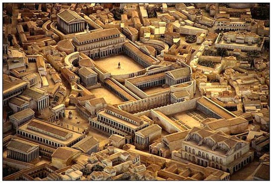 Archeologist Yoram Tsafrir states that, in contrast to our time when the vegetative land cover of urban areas is perceived as essential, the Roman perception was the exact opposite. He writes, “The designers of the Roman city did not allocate open green areas for the well-being of the residents, as customary today. The landscape visible to the residents was mainly a splendidly constructed and well-planned landscape” (Tsafrir 1988, p. 65), see Figure 2. The saturated construction of the city, with no allocation of green areas, was perceived by the architects of the Roman city as an aesthetic public space that represented their engineering skills and imperial power.