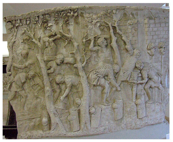 Roman soldiers felling trees for construction purposes. From: Trajan’s Column. Source: Wikimedia commons.