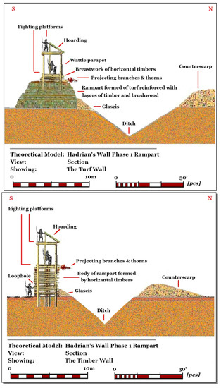 Reconstruction of two types of rampart (turf rampart and timer rampart), in Hadrian’s Wall (Vallum Aelium). Source:http://structuralarchaeology.blogspot.co.il/2011/12/hadrians-first-wall.html. (by permission of Geoff Carter. See: http://structuralarchaeology.blogspot.com/)