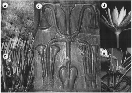 The “Union” Symbol (sema-taui) of ancient Egypt. (a) Fertile stalks of the papyrus plant present a cluster of chaffy bracts and a spray of slender shoots. Details of these complex structures are often simplified as a campanulate motif in the visual arts (Figure 2c). (b) Papyrus stems are supported at their base by long, chaffy bracts. (c) Early renderings of the sema-taui symbol portray a central lotus stalk that is supported by knotted lotus and papyrus stems. Note that the central stalk arises from a testicular base and supports a three-membered palmette (lotus flower) at its apex. Throne of Chephren, Giza, 26th c. BCE (Cairo Museum). (d) The profile view of a polypetalous Egyptian water lily exhibits three prominent green sepals and a palmate array of blue-pigmented petals. (e) Lotus stalks lack the distinctive basal bracts of a papyrus shoot. Note that a new bud has arisen before a flower stalk has finished its three days of anthesis.
