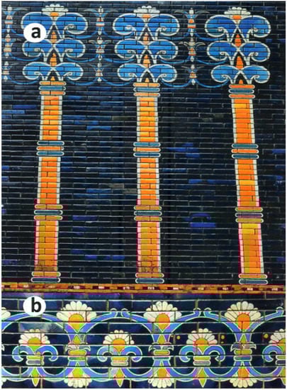 The famous blue gates of Ishtar at Babylon portray lotiform trees of life without a hint of ambiguity, but with Egyptian symbolic elements that now reflect the nuances of Mesopotamian iconographic craftsmanship. An interlinking series of water lilies that encompass the interlinking, stout trees conserve the ancient Egyptian bud-and-blossom motif by alternating flowers with opposing bud and blossom elements with flowers comprised of opposing full-blown flowers (Figure 6b). A running ‘tendril’ of water lily peduncles creates a continuous chain of floral motifs. This stylized composition is then reflected in a series of linked sacral trees at the center of the gates, in what may therefore be deemed the symbol par excellence of the widely celebrated goddess. The stout trunks are surmounted by a vertical configuration of three superimposed lotus tridents, the upper of which displays a bright radiate display of petals (Figure 6a). This common exhibition of three flowers likely represents that standard three-day duration of water lily anthesis. Between each of the stacked flowers is observed a tridentate lotus bud, whose drooping stalks create a standard symbol of everlasting life in Egypt and throughout the Fertile Crescent: recurrent water lily buds and blossoms. The sacral tree trunks emerge from a water line in the lower register and exhibit the familiar collars around the trunks, which conventionally serve as a point of connection between sacral trees and water lily blossom aureoles (Figure 5b,c).