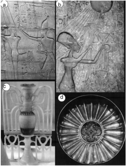 Egyptian libation scenes are commonly observed on temple and tomb walls, papyri, thrones, and coffins, suggesting that drinking lotus nectar (or perhaps extracts of water lilies, as suggested by (Emboden 1989a, 1989b)) within the inner sanctums of Egyptian temples was as common in burial rituals as it was in daily life (Lange and Hirmer 1968, Figure 226; Gillispie and Dewachter 1987, vol. 3, pl. 15). Numerous lotiform libation cups and vases were unearthed, for example, from the tomb of King Tutankhamen (Lange and Hirmer 1968, pl. xxxiii), some alluding in script to the king’s achievement of immortal life (Assaad and Kolos 1979, p. 32; Fox 1951, pl. 3). One such vessel is a long-stemmed alabaster drinking cup fashioned in the image of a lotus corolla (Desroches-Noblecourt 1989, Figure xxiia), while another common vessel type is an alabaster ‘oil vase’ fashioned as a sema-taui symbol (Figure 7c). The central axis of this receptacle is decorated with a lotus perianth, implying that the vessel contains the essence (or semen) of the floral eye of Horus. These vessels compare closely with libation lotus cups in a ritual scene on a golden shrine of King Tutankhamen and Queen Ankhesenamen, where the convivial couple is observed sharing a libation with lotus flowers and buds in their hands (Lange and Hirmer 1968, pl. xxxiii).