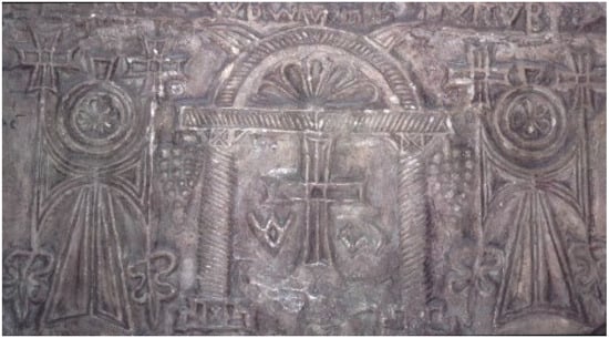 Given the aforementioned mythic roles of the Egyptian lotus, it is not surprising that the plant is often associated with Egyptian hieroglyphs and symbols that relate to eternal life. Foremost among these is the ankh insignia (Figure 3a–c), an enduring motif that eventually served Coptic churches in post-dynastic Egypt as the symbol of the Christian tree of life and sacrificial cross (i.e., the crux ansata; see discussion below and Figure 7; (Lurker 1980, p. 27); Table 1, l. 9) before it disappears from historical records a few centuries after Egypt’s adoption of Christianity. The ankh is one of the older and more ubiquitous symbols of ancient Egypt and one that apparently symbolized the lotus flower when it was held to the nose of gods and pharaohs (Figure 7b; (Lange and Hirmer 1968, pl. LI; Schäfer 1974, Figure 20; el-Mallakh and Bianchi 1980, p. 44; Wilkinson 1992, p. 177)). While various anthropomorphic, zoomorphic and chimeric gods and goddesses present the ankh to Osiris and Horus as a means to affect their sanctification, resuscitation, and resurrection (i.e., eternal occurrence), the sign is also employed as a symbol of the Nile’s ‘waters of life,’ usually by portraying a cascading stream of ankh emblems from libation vases (Gillispie and Dewachter 1987, 1: pls. 10.2, 2, 11.A, 13.1; Wilkinson 1994, pp. 159–60) or by fashioning libation vases in the image of an ankh insignia (Schäfer 1974, Figure 30). In either case, the ankh sign symbolized the vitalizing breath and creative seed (i.e., ‘waters’ or ‘efflux’) of the sacred phallus and/or solar eye of various Egyptian lotus-gods, whether Nefertum-Ra, Osiris-Ra or Horus-Ra.