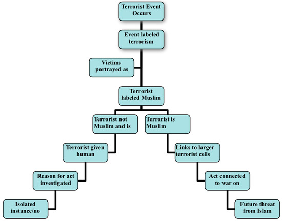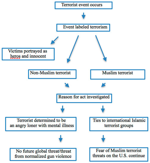 The pattern of coverage in this study varied slightly from that in Figure 1 from Powell’s 2011 study in that an event was not immediately labeled as terrorism and the perpetrator was labeled as Muslim. Rather, once a terrorist event occurred, the perpetrator was first labeled Muslim or non-Muslim before the reason for the act was investigated. If the perpetrator was not Muslim, they were frequently described as an angry loner with mental illness who was part of the gun violence culture in the U.S. If the perpetrator is Muslim, connections to international Islamic terror groups are investigated and the war of Islam on the U.S. is furthered (Figure 2), widening the East/West divide promoting Islamic terror and Muslims as the “other” (Semati 2010).