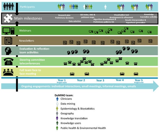 The DoMiNO research team consisted of over 20 team members. The team included researchers, clinicians, graduate students, and knowledge users. Research members’ expertise included EH & public health, computing science (data mining), epidemiology, geography, neonatology, obstetrics and gynecology, pediatrics, and knowledge translation (KT). The team also included knowledge users from non-government organizations (NGO), government agencies, which focus on science and policy and data providers. This diverse collective expertise reflects the complexity of the question and the research. Most members of the team resided in one city. The rest of the team was dispersed in different geographical locations and time zones.