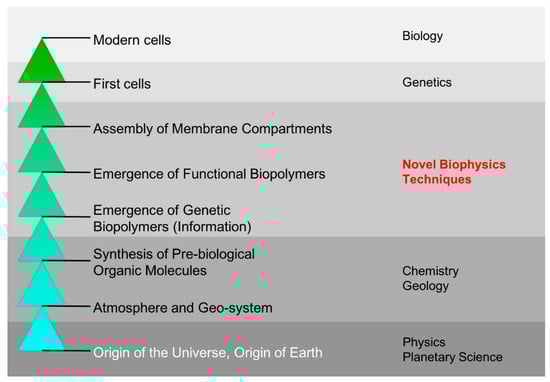 A chronological view of origins of life research (from bottom to top), starting from the origin of Earth and ending at modern cells. Specifically, biophysicists in Japan have been contributing towards knowledge on the emergence of the first genetic and functional biopolymers as well as the assembly of the first membrane compartments on early Earth; these are believed to be important steps in the origins of life. As the biophysics research community in Japan has a good track record in developing new techniques and methodologies for biological analysis, by incorporating these new techniques along with a renewed focus on more international and interdisciplinary collaborations, the entire origins of life community can glean even more knowledge in these poorly-understood, but incredibly important, facets of the origins of life. Traditionally, the most advances in each problem (left) have been supplied by researchers in the listed fields on the right. However, given the gradual advancement of research into an interdisciplinary effort, we will not limit the solving of these major problems to one specific field. Additionally, understanding the origins of life will inherently require an understanding of all of the problems listed, and then some, and thus only through collaborative efforts of all fields listed, including biophysics, can the origins of life be fully (or at least better) understood.