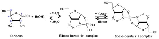 Formation of ribose–borate complexes which stabilize ribose by inhibiting the hydrolysis of ribose (by environmental factors). Reprinted with permission from Furukawa, Yoshihiro, Mana Horiuchi, and Takeshi Kakegawa. 2013. “Selective Stabilization of Ribose by Borate.” Origins of Life and Evolution of the Biosphere: The Journal of the International Society for the Study of the Origin of Life 43 (4–5): 353–361 [50]. Copyright 2013 Springer Nature.