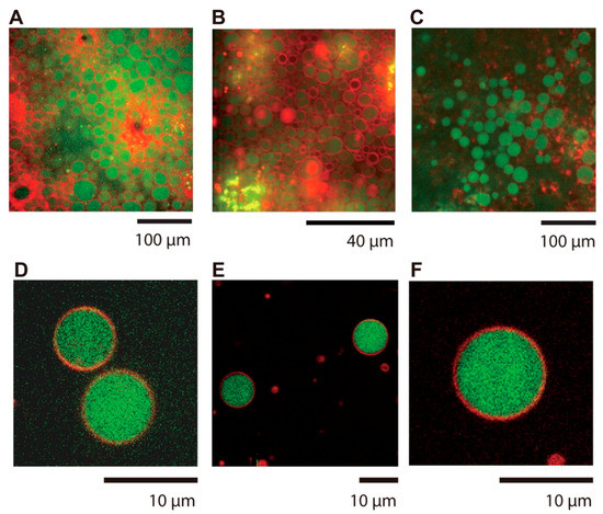 Phospholipid (red; Rho-PE stain) vesicles encapsulating DNA (green; YOYO-1 stain) on a surface (A–C) and after rehydration into solution (D–F). Scale bars as described (A,D) fragmented salmon DNA, (B,E) λ phage DNA, and (C,F) T4 phage DNA. Reprinted with permission from Shimobayashi, Shunsuke F., and Masatoshi Ichikawa. 2014. “Emergence of DNA-Encapsulating Liposomes from a DNA-Lipid Blend Film.” The Journal of Physical Chemistry. B 118 (36): 10688–10694 [91]. Copyright 2014 American Chemical Society.