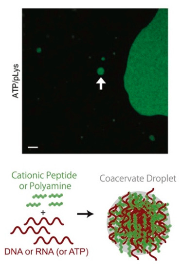 Example of a coacervate droplet system composed of a nucleotide (ATP) and a cationic peptide (poly-lysine; pLys) (10 µm scale bar), resulting in visible liquid-liquid phase-separated compartments. Top image reprinted with permission from Jia, Tony Z., Hentrich, Christian, Szostak, Jack W. 2014. “Rapid RNA Exchange in Aqueous Two-Phase System and Coacervate Droplets.” Origins of Life & Evolution of the Biospheres 44 (1): 1–12 [108] under a Creative Commons License.