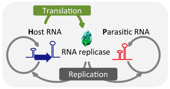 Replication scheme described in [68]. Briefly, a host RNA (blue) contains a sequence which codes for translation of an RNA replicase enzyme. This RNA replicase in turn catalyzes the replication of the host RNA. However, a parasitic RNA (which also replicates by the replicase enzyme), but without the replicase coding region, also exists in the system. Reprinted with permission from Bansho, Yohsuke, Taro Furubayashi, Norikazu Ichihashi, and Tetsuya Yomo. 2016. “Host-Parasite Oscillation Dynamics and Evolution in a Compartmentalized RNA Replication System.” Proceedings of the National Academy of Sciences of the United States of America 113 (15): 4045–4050 [68]. Copyright 2016 National Academy of Sciences.