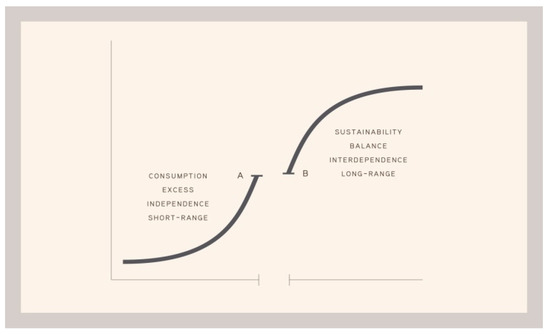Between the two periods, there is also a difference in the predominant human values, attitudes, and behavior (Figure 6). In Epoch A, when there are few perceptible limits, values of unrestricted growth, expansion, and exploitation of both natural and human resources are rewarded with success and tend to predominate. Consumption, independence, and short-range thinking are most beneficial to the individual or group. In the different conditions of Epoch B, where resources are limited and growth is slowing, high value is placed on conservation, sustainability, interdependence, and long-range thinking.