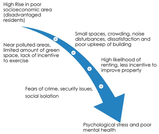 High-rise buildings can have direct and indirect effects on health. Polluted air quality, unsafe heating systems, the presence of toxic substances, pests, and overcrowding cause direct biological, chemical or physical effects and are easier to address than indirect effects such as individual characteristics and socio-economic circumstances []. This paper focuses on the indirect effects on health. We summarise the evidence for links between stress and social wellbeing in city settings, specifically the relationships between high-rise living and social wellbeing and occupant’s stress levels, and their influence on mental health. We then formally review the literature on high-rise living and mental health and explore how exacerbation of mental health issues of high-rise dwellers in poor socio-economic areas could be reversed with a number of strategies.