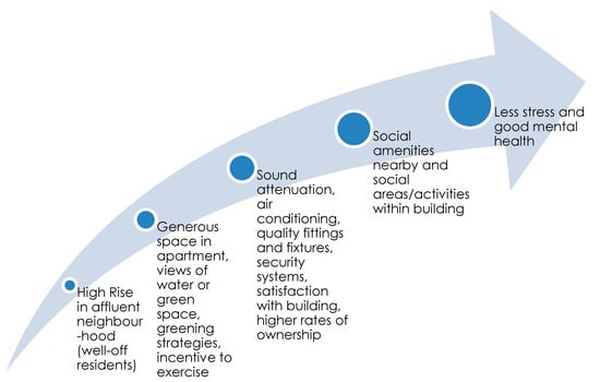 A possible causal sequence of high-rise apartments in affluent areas where good environmental health, satisfaction of living space, access to green space and social amenities that lead to higher ownership, may lead to less stress and good mental health.