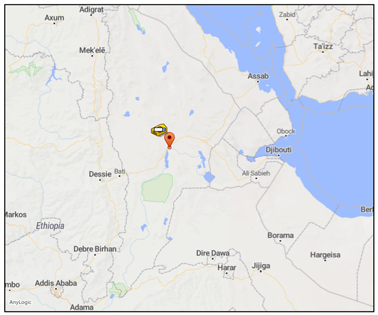 The AB simulation modeling component of the AnyLogic software was used to model the dynamic between the two groups of agents considered in this case study, i.e., the borehole sites and the SC crews. The conceptual AB model used here is a modified version of the Field Service model proposed by Borshchev [6]. It has been modified to include a GIS map of a region of Ethiopia (Afar region) of interest, where 179 borehole sites are considered (Figure 2). The sites have specific GIS coordinates [14] and are spread over a 900 km long north–south stretch between Addis Ababa and Adigrat.
