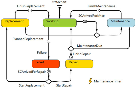 Figure 3 shows the statechart used to map the lifecycle of each borehole site equipment which can go through five possible states over time: working (green), failed (red), replaced or repaired (yellow), or under maintenance (blue). The equipment at all borehole sites is assumed to be initially working (green). The transition from one state to the next can be triggered by (i) a state change rate (e.g., failure rate); (ii) a timeout (e.g., time to finish maintenance, replacement, or repair) or delay; or (iii) a message between agents (e.g., SC arrived for repair, SC arrived for maintenance). In Figure 3, places of decision (equivalent to “if” statements) are represented by three lozenge-shaped symbols. One choice (probabilistic) may be to repair or replace the equipment when an SC arrives at a site where the equipment failed; repair is the default. The equipment is automatically replaced when its age is such that it has experienced at least a certain number (4 in the case of Table 1) of consecutive maintenance periods (90 days). After the repair is done, a decision (deterministic) needs to be made whether the equipment is already due for regular maintenance (every 90 days); no maintenance is the default. Finally, another deterministic decision (planned replacement) when an SC arrives at a site to carry out regular maintenance (every 90 days) is whether to proceed or replace the equipment; maintenance only is the default. As in the case of failed equipment, replacement automatically takes place if its age is such that it has experienced at least a certain number (4 in the case of Table 1) of consecutive maintenance periods of 90 days.