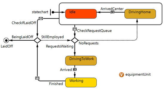 Figure 4 shows the statechart for the motorized service crews (SC), which can be in four different states: idle at the service center (red), working (yellow), or on the move either to the service center (waiting for a message from a borehole site), or to a borehole site for servicing (orange). The service crews transition from one state to another after exchanging different types of messages: (i) from each borehole site (person or signal) to the service crews (e.g., check request messages) via the service center (e.g., request for service message); (ii) from the service crews to the service center (e.g., accept message to proceed or re-check for a message and take it); (iii) from the service crews to the borehole sites (e.g., arrived message); and (iv) from the borehole sites to the service crews (e.g., finished message that the service is completed).