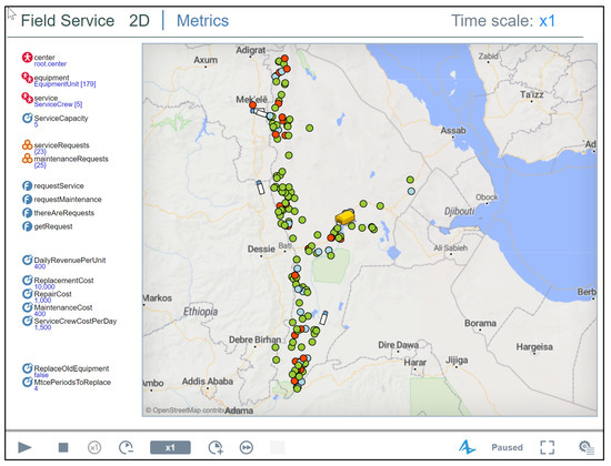 The agent-based Field Service model from the Big Book of Simulation Modeling by Borshchev [6] comes with a flight simulator consisting of two parts: (i) a two-dimensional (2D) model (Figure 5) showing the agent dynamics (movement of the service crews and states of each borehole site) and (ii) a metrics and statistics window showing time-depend graphs (Figure 6). The model FieldService2DEthiopia used here is available from the author upon request.