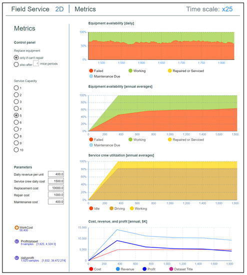 A unique feature of the flight simulator shown in Figure 6 is the possibility of changing at any time: (i) the number of service crews using the service capacity parameter (from 1 to 10 in the present example), (ii) the daily revenue per unit, and (iii) the service crew, replacement, repair, and maintenance costs. Finally, the user can decide whether the borehole equipment is automatically replaced if it cannot be repaired, or if it has also experienced an arbitrary number of consecutive maintenance cycles of fixed duration (four cycles of 90 days each in the present example). Both decisions were discussed in Section 2.1.1.