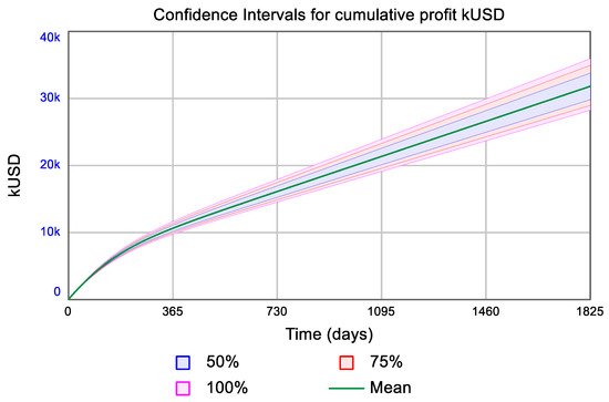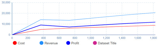 As an example, Figure 9 shows the variation of the cumulative revenue, cost, and profit over five years for the input data mentioned above. The cumulative profit predicted by the AB method (listed in Table 2) is also shown for comparison.