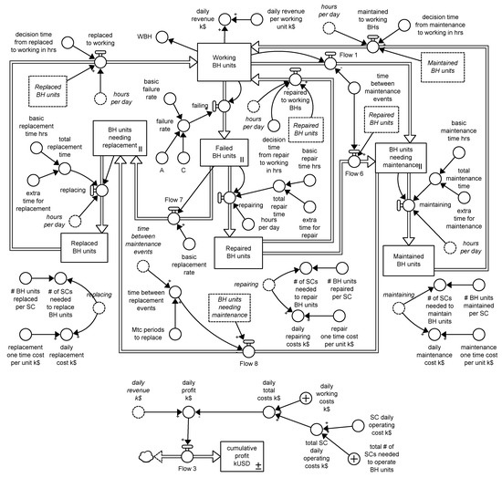 Stock-and-flow system dynamics (SD) model showing the dynamic between the different borehole equipment states.