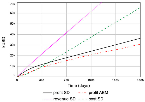 The SD method assumes a high level of abstraction and homogeneity when considering the interaction between the two groups of agents. The method requires fewer details than the AB method and uses an averaging process to predict the continuous behavior of the two groups of agents. Various parametric studies can still be carried out to analyze, for instance, the impact of multiple factors on the cumulative profit. However, the influence of the location of the service center on the profit cannot be analyzed.