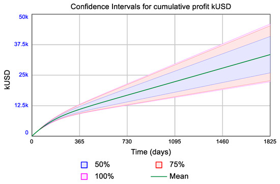 The STELLA Architect software can also be used to carry out optimization work using different algorithms such as the Powell, grid, and differential evolution methods [21]. As an illustrative example, the differential evolution algorithm was used to determine the values of decision times and extra times that lead to the maximum cumulative profit at the end of five years (1825 days). All other model parameters were assumed to be the same. An optimal profit of $50,408 (k$) was found for the following input values: