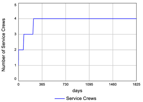 For these conditions, the management of the borehole sites can be accomplished by changing the number of service crews providing the services of repair, replacement, and maintenance. In this example, each service crew is assumed to serve five borehole units per day. Figure 14 shows the variation of the total number of service crews with time.