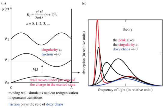 Singularity in the rate of molecular quantum transitions: a potential box with a movable wall (a) and the optical absorption band shape dependent on the dozy chaos available to a given quantum transition (b); the band shape with the strongly pronounced peak (J-band) corresponds to the least dozy chaos [37]. The wall is fastened to the abscissa axis by a freely movable hinge and can move with a certain friction or without friction against the axis. Such a wall simulates the environmental nuclear reorganization in the molecular “quantum” transitions, where dozy chaos plays the role of friction. In the theory [6], this results in the dozy-chaos dependent optical absorption band being displaced to the red spectral region and narrowed (b). The position, the intensity and the width of the optical absorption band are determined by the ratio between the dozy-chaos energy and the reorganization energy (see Section 3). The smaller the value of is, the higher the degree of organization of the molecular “quantum” transition, and the more the intensity and less the width of the optical band (b). The position of the wing maximum is determined by the energy , whereas the position of the peak is determined by the energy [37]. (Original citation)—reproduced by permission of The Royal Society of Chemistry.