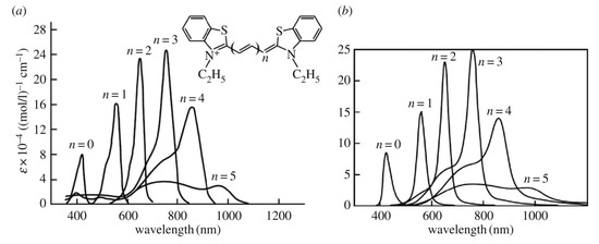 Experimental [52,53] (a) and theoretical [4] (b) monomer’s optical absorption spectra dependent on the length of the polymethine chain , where are certain roughly equal bond lengths in the chain (thiapolymethinecyanine in methanol at room temperature; is the extinction coefficient) [37,39,54]. The optical absorption band with corresponds to the dynamic electron–nuclear–reorganization resonance (the Egorov resonance, see Section 5) or is close to it. (Original citation)—reproduced by permission of The Royal Society of Chemistry.