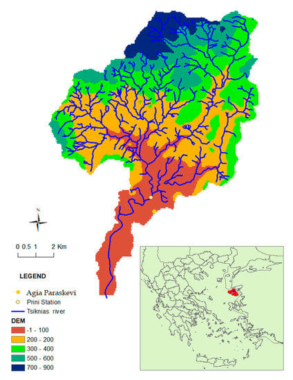 The meteorological station in Agia Paraskevi (95 m elevation) operates in the basin, recording precipitation, wind speed, wind direction, solar radiation, cloud cover, humidity, and barometric pressure, with an annual mean rain value of 664 mm. Water level data used in the modeling were sourced from the telemetric station (Prini bridge) installed in 2014 which records flows at 15 min intervals [].