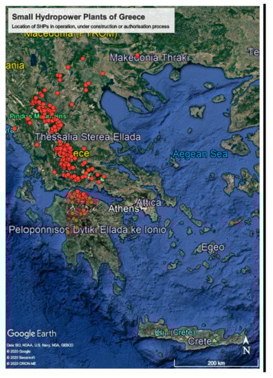 SHPs are totally absent from Greek islands, despite the high numbers of water mills operating in the past. For instance, in Lesvos island, 217 water mills operated in the last century, with 137 mills established in perennial-flow small streams and 80 in intermittent-flow streams []. Nowadays, none of these mills are active and there is no plan for SHP operation in the existing water mill locations. Currently, the energy demands of the island are covered by burning oil fuels and diesel, and energy policy-makers plan to invest in electrical submarine cables for energy supply. In the future, hydropower exploitation plans may contribute to the sustainability and energy autonomy of the island.
