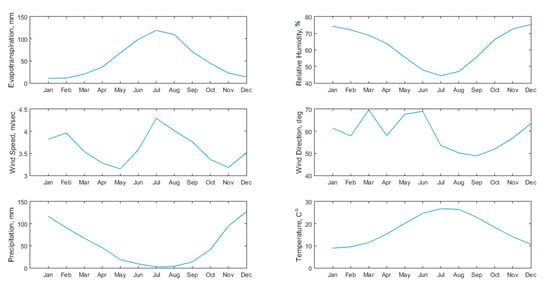 Tsiknias River is selected for the current study for several reasons, i.e., (a) the existence in the past of water mills in its courses; (b) the intermittent character of its flow; (c) the existence of a long time-series of meteorological and flow data; and (d) the objective of the North Aegean water management plan is the construction of a water-storage reservoir (10 Mm3 capacity) close to river estuaries. The Tsiknias basin is characterized by high variation in precipitation and evapotranspiration during the year (630 mm and 1052 mm mean annual height, respectively). Maximum values of air temperature, evapotranspiration and wind speed are observed in July–August and the maximum precipitation in December (~130 mm/month). In the summer period, the lowest values of precipitation and relative humidity are observed (Figure 3). The analysis of precipitation records of Agia Paraskevi station shows a precipitation pattern of high intensity. Tsiknias River flows during the winter period from November to April with an average flow of 0.92 m3/s. The maximum flow is observed during high rainfall events. For instance, in December of 2017 (30/12/2017), the major flood event of the hydrologic year is measured with a flood peak of 237 m3/s (hourly flow value) and a 15 h duration, originated by a 47 mm precipitation height.