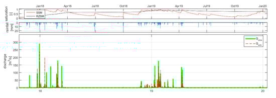 The calibration of the flow resulted in a set of final parameter values (see Table 1) that gave much better model efficiency values (NSE = 0.6; KGE = 0.8) when compared with previous studies []. The validation performance of the model gave the KGE value of 0.5, which is mostly related to specific weakness of the observed data (observation of flow increase without rain and changing geometry of the location where the logger is installed due to severe erosion). Figure 4 shows the hydrograph of observed vs. simulated flow for the calibration period demonstrating the model’s ‘fit’ and the variation of precipitation and soil saturation in the basin for the same reference period (October 2017 to January 2020).