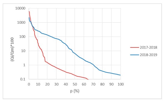 Flow duration curve for the hydrological years 2017–18 and 2018–19.