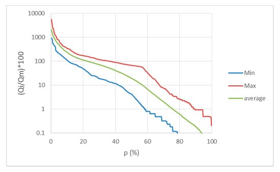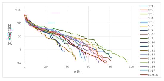 The flow intermittency has a serious effect also on the hydropower capacity of the small streams. The flow duration curve (FDC) is essential for the estimation of their hydropower capacity (Figure 5). The mean annual FDC is constructed according the standardized non-parametric procedure developed by Vogel and Vennessey (1994) with the duration of one hydrologic year []. In this approach, if the flow data series covers N years, we obtain N separately of the FDC and the mean annual FDC is thus calculated by assigning the mean flow value among the available N to each duration on the x-axis. To facilitate the comparison of the run-off regime of the studied rivers, each river discharge, Qi, is standardized by the mean annual flow, Qm, of the river. The resulting graph (Figure 5) uses a logarithmic scale for the discharge axis in order to show low flows more clearly [].