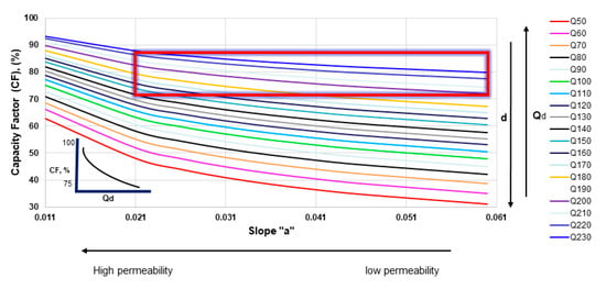 The FDC is a very important tool to study and assess the hydropower potential of intermittent streams. Considering the relation between the slope of the annual FDC “a” and the capacity factor, Figure 8 graphically visualizes the domain area of the intermittent streams. The current study showed that slope “a” ranges between 0.021 to 0.046 and the capacity factor may remain higher than 75%, as shown by the red box found in the upper right corner of Figure 8. A serious limitation in the design of the RoR plants in intermittent-flow streams is the limited number of operational days of the plant due to the dry river bed. Low design discharge values are considered to maintain high CF values, otherwise the storage-type SHP may be selected.