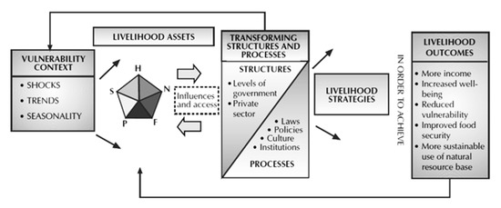 From an SLF perspective, resilience is achieved through enhancing household and community assets enabling resilience to vulnerability and livelihood strategies that allow for multiple outcomes towards stability and growth—these include but go beyond survival subsistence strategies to include real development processes and outcomes [28].
