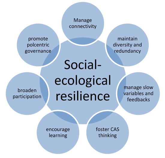 The Stockholm Resilience Centre has recently formulated seven principles for resilience thinking projects [54]. The seven principles (see Figure 6 below) are (1) maintain diversity and redundancy, (2) manage connectivity, (3) manage slow variables and feedbacks, (4) foster complex adaptive systems thinking, (5) encourage learning, (6) broaden participation and (7) promote polycentric governance systems. As noted above, these principles appear to coincide well with indigenous thinking and are a platform for future thinking.