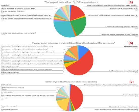 In Figure 2b, it is seen that more than half replied, if the respondent acted as a city decision maker, that E-platforms (citizens connecting using their smart phones) is the preferred smart city strategy that first comes in mind. In the question if there are any benefits of having smart cities (Figure 2c), more than 40% replied that the obvious benefit is that it gives the opportunity to be able to adapt under different conditions. A percentage of 17% replied that smart cities mean reduced environmental footprint. Therefore, as a result, what was ranked high in the respondents’ opinions (in total almost 60%) was adaptability and environmental benefit.