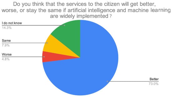 It was believed by the authors that in the wide smart city deployment in the near future, artificial intelligence (AI) and machine learning (ML) will play a crucial role. Therefore, one of the questions asked in the survey was to answer if they think that the services to the citizen will get better, worse, or stay the same if artificial intelligence and machine learning will be widely implemented under a smart city concept (Figure 3).