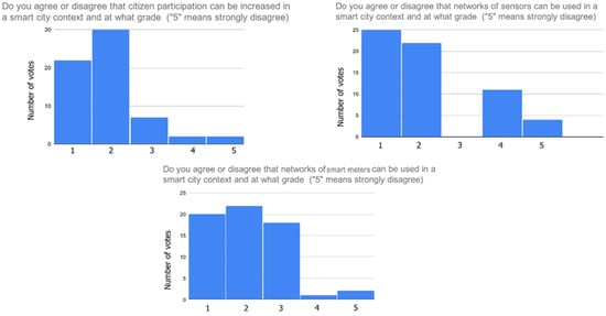 Another batch of questions in the survey were those focused on the grade of agreement with some statements of the personnel of the regions and municipalities. The questions were focused on how much they agree or disagree that (a) citizen participation [] can be increased in a smart city context, (b) networks of sensors can be used, (c) wide adoption of smart meters can be used (Figure 5). The results revealed that although everyone strongly agreed that citizen participation will be increased, that was not exactly the case in the other two questions regarding sensors and smart meters adoption. Especially for the networks of sensors, there were clearly some disagreements in comparison with the other two questions. A rough interpretation could be linked to the fact that a large deployment of sensors could again violate in some degree the personal data freedom levels. The same could be assumed for the smart meters, since a high share of moderate acceptance votes (“3”) are noted.