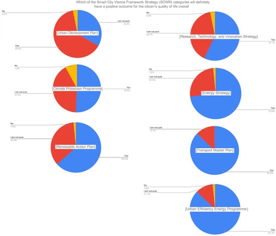A well-known smart city framework for Vienna was followed in order to ask the participants in the survey questions relevant to the overall quality of life improvement. The Smart City Wien Framework Strategy (SCWR) was developed to set the priorities and pave the way for the city Vienna to focus on the wider European climate targets for the next decades, specifically focused on energy, mobility, buildings and infrastructure []. The questions to be answered were trying to link the different SCWR categories with the quality of life of the citizens (Figure 7).