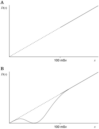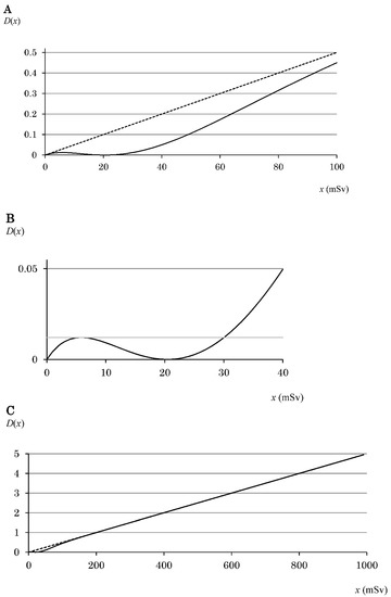 Figure 2A shows D(x) in the range of 0–100 mSv. From x5, it was determined that x3 = ~0.285/a and x4 = ~1.469/a [5], which correspond to ~5.8 and ~30.0 mSv, respectively, and give a hormesis region of 5.8–30.0 mSv (Figure 2B). In Figure 2B, D(x) is in the range of 0–40 mSv, and the hormesis region is shown in an easy-to-understand manner. Furthermore, in Figure 2C, D(x) is in the range of 0–1000 mSv, and the LNT at ≥100 mSv is shown in an easy-to-understand manner.