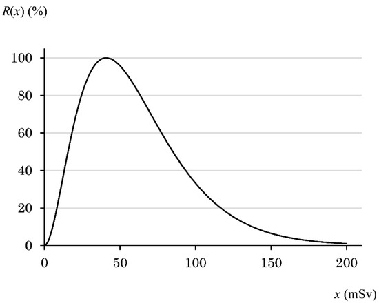 R(x) reaches a maximum when the radiation dose is x1, and the value of x1 is 2/a [5], while R(2/a) is (2/ea)2. Setting the maximum value of R(x) to 100 yielded Equation (5), and a graph shown in Figure 3 was obtained. When the value of a was 0.0489, x1 was 40.9 mSv (Figure 3).