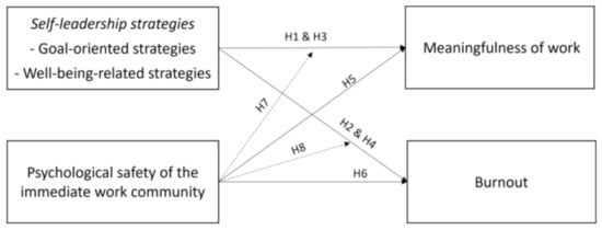 Third, even though research on self-leadership has been active since the 1980s, the prerequisites for effective self-leadership are yet to be defined more closely. There is established knowledge on several determinants of self-leadership, but the role of psychological safety in facilitating it has not been researched. Psychological safety essentially supports a culture of initiative and active roles for individuals at the workplace [] and has been shown to play a central role in many positive workplace behaviors []. Therefore, there is reason to believe that it may create a fruitful environment for proactive self-leadership behavior as well and plausibly moderate the relationship between individual employees’ self-leadership behavior and workplace well-being (meaningfulness of work, burnout)—mechanisms examined in the current study.